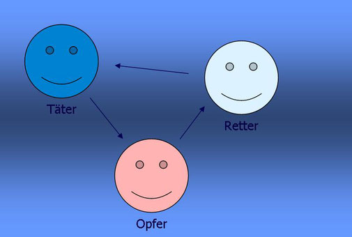 Diese zeigt uns ein Beziehungsmuster auf, in dem es die drei Rollen Täter, Opfer und Retter gibt.